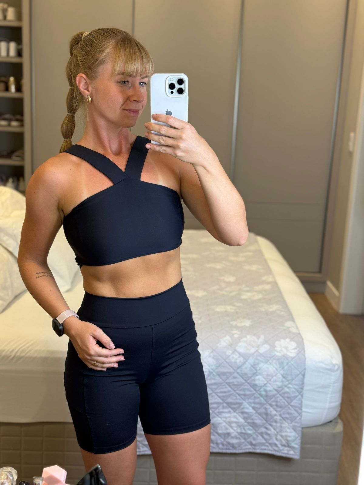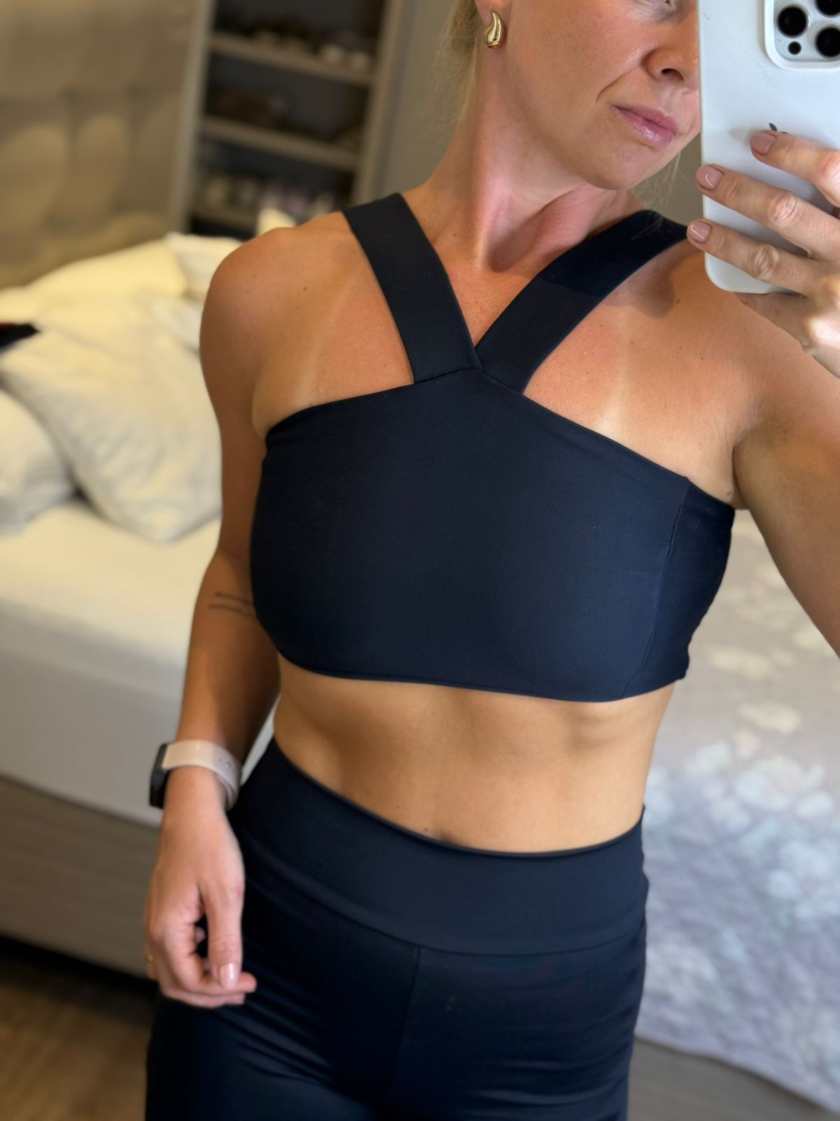 O Top Bárbara, possui alças mais largas transpassadas na frente, com abertura para bojo removível, por uma pequena abertura no forro, elegante e super casual, ideal para compor looks despojados ou para acompanhar em atividades de médio impacto.